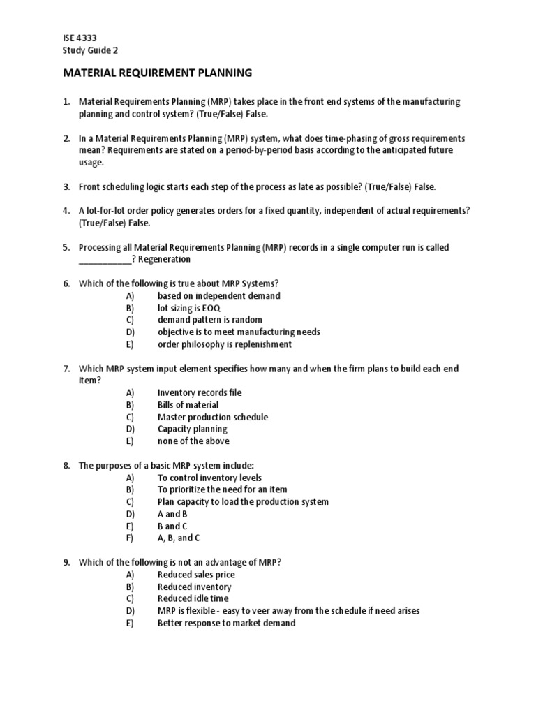 What provides feedback to the capacity plan master production schedule and production plan so planning can be kept valid at all times. Economic Order Quantity EOQ. Materials planning can be set to automatically generate. Order an EOQ or ERL amount. E Storage location MRP. Computer-based material requirements planning MRP systems are used by many businesses to keep track of the resources needed for production or lot sizing and distribution. Storage location MRP Ans. Inventory record file E. When MRP II systems include feedback they are known as.