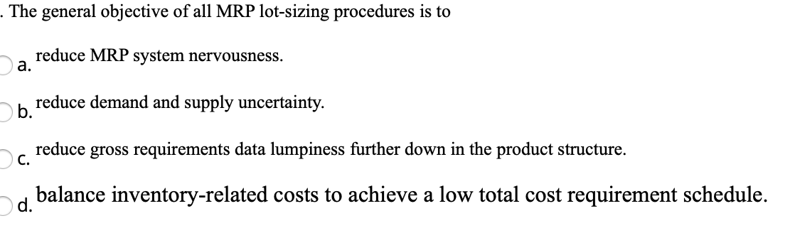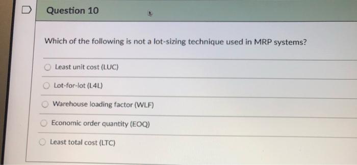 Economic order Quality isnothing yet the bespeak of one EOQ. Which of the following statements about MRP is TRUE. Only one answer is correct A Manual Reorder point planning. B Automatic reorder point planning. Information with cost data. The lot-sizing techniques presented are lot-for-lot L4L economic order quantity EOQ least total cost LTC and least unit cost LUC. Warehouse loading factor WLF E.